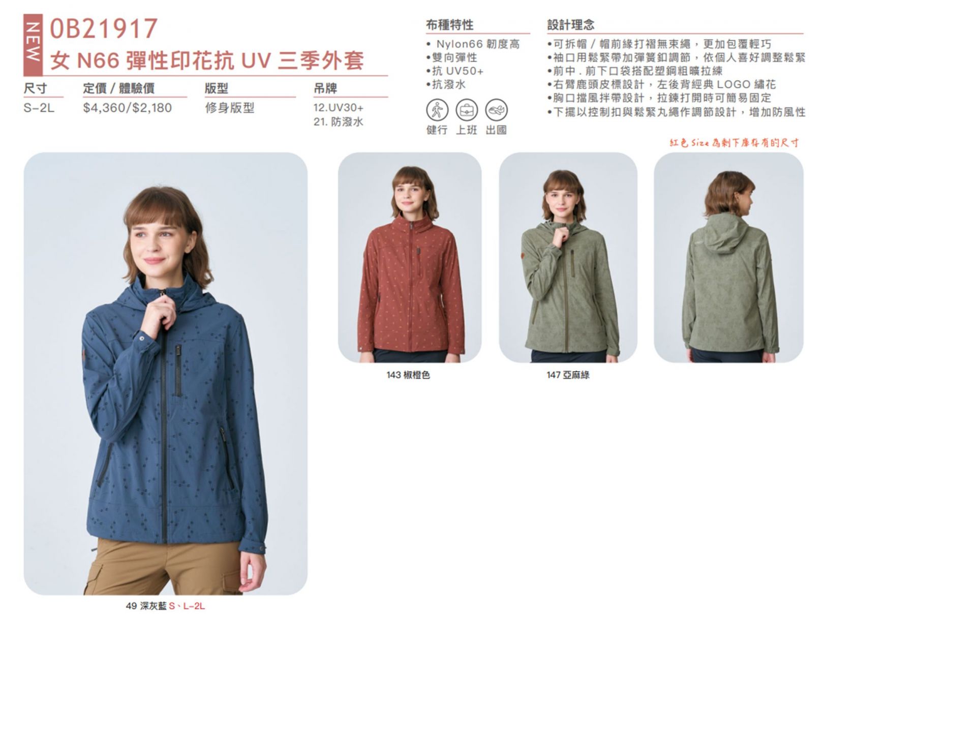 產品特性  可拆帽,帽前緣打褶無束繩,更加包覆輕巧、袖口用鬆緊帶加彈簧釦調節,依個人喜好調整鬆緊、