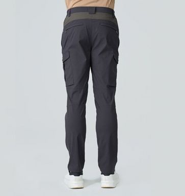 同布種拼接 / 左右不對稱貼袋 / 膝圍處車摺及褲底三角岔布增加活動量 / 側袋鹿頭皮標裝飾 / 左後膝下LOGO繡花